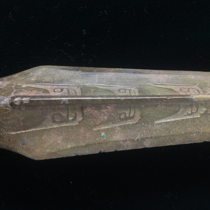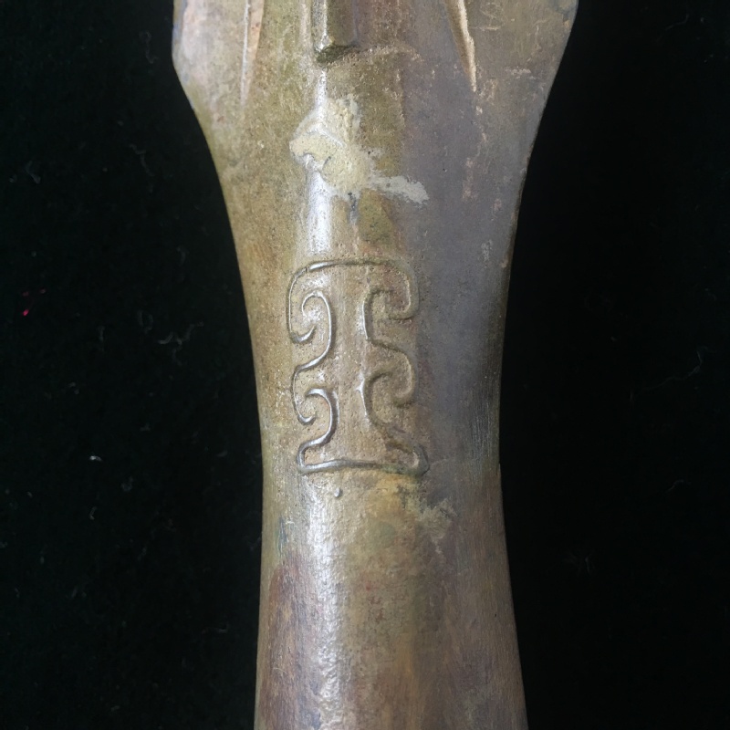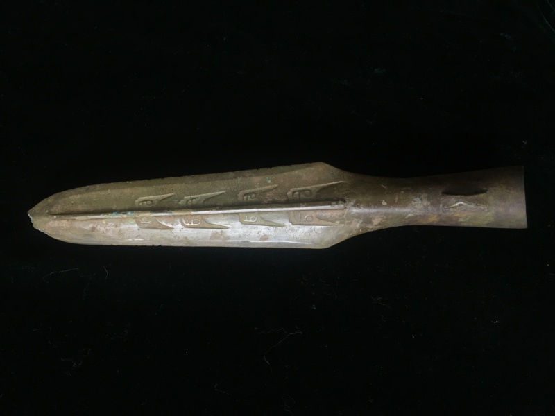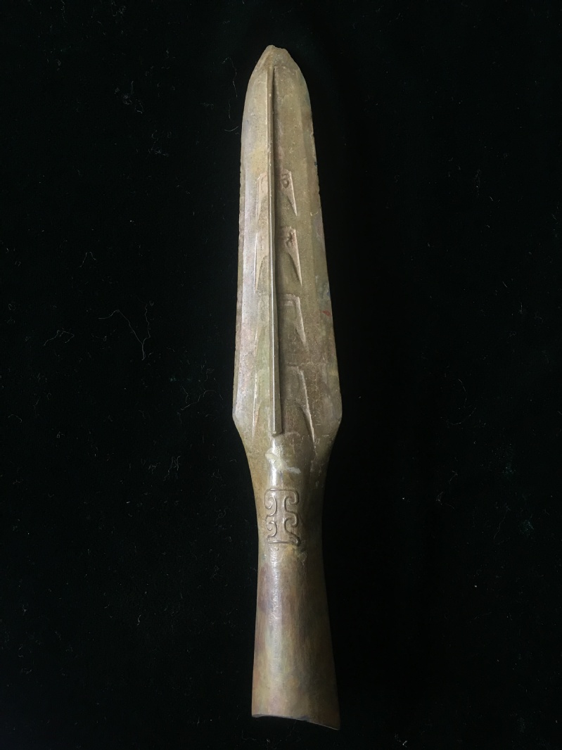 【简介】国家二级文物;出土于徐州地区,系王侯专用兵器;矛锋尖锐,刃口锋利,矛体花饰精美对称,正面篆铭字体特作结构艺术处理,背面有凸起穿孔以便绳索栓固矛杆;证明两千多年以前兵器制造技术先进。