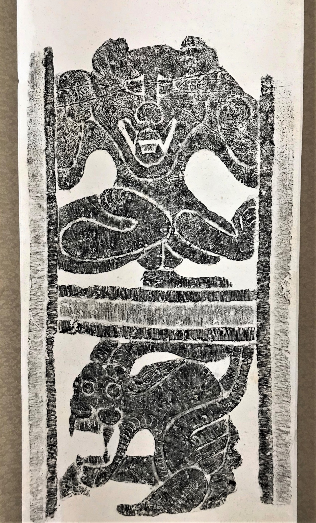 【简介】此图为浅浮雕,画面分成上下两部分。上层的似人似熊的形象是傩仪中的打鬼头目方相氏。西周时期,在进行傩祭时会表演驱鬼逐疫的戴着兽形面具的歌舞,专任傩祭的中心人物叫方相氏,嫫母(黄帝妃之一)是最古老的方相。嫫母任方相的原因之一就是因为其长的丑,符合原始人“以丑制丑”的观念。下层是一个似羊的动物,双角、圆眼、张口、有獠牙、带翼。“羊,祥也。”“祥,福也。”汉代吉祥多做“吉羊”。将方相氏与羊放在同一个画面,具有辟邪吉祥的象征含义。