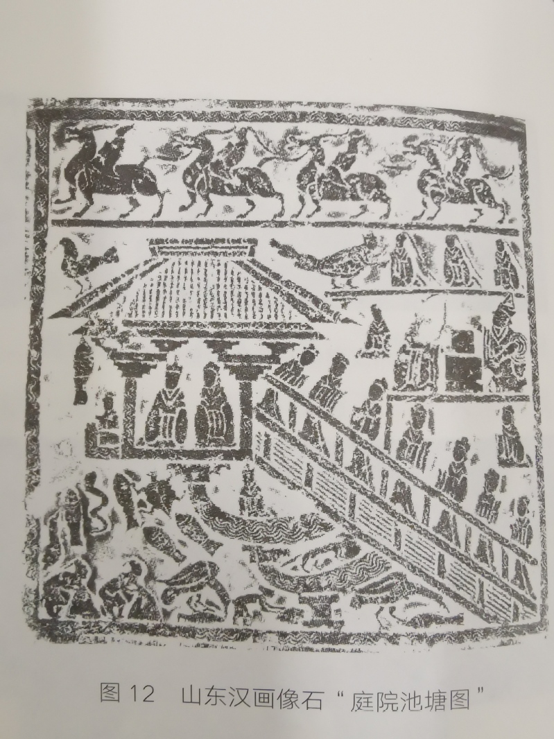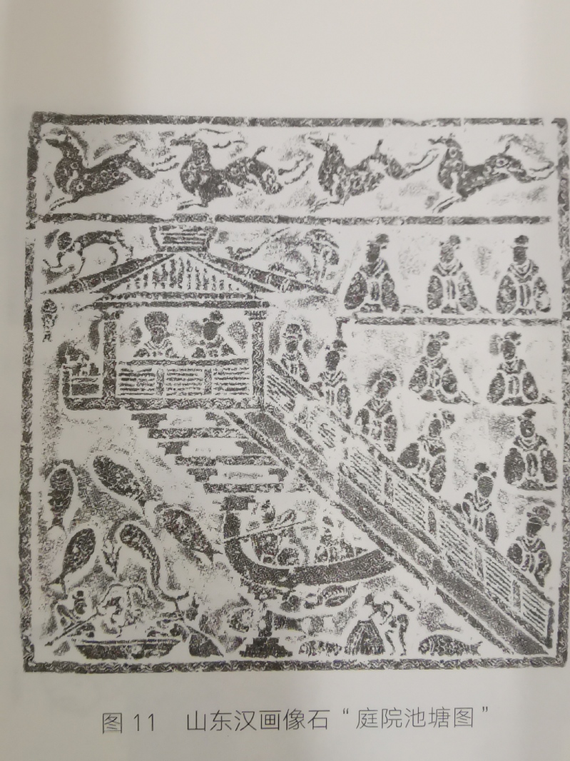 图11为山东汉画像石,在庭院旁的池塘内,各种鱼游戏水底,有人用鱼叉插鱼,有人乘船用网捕鱼。图12为山东汉画像石,也是在庭院旁的池塘内,各种水产游戏水底,有二人用网捕鱼,有人徒手摸鱼。