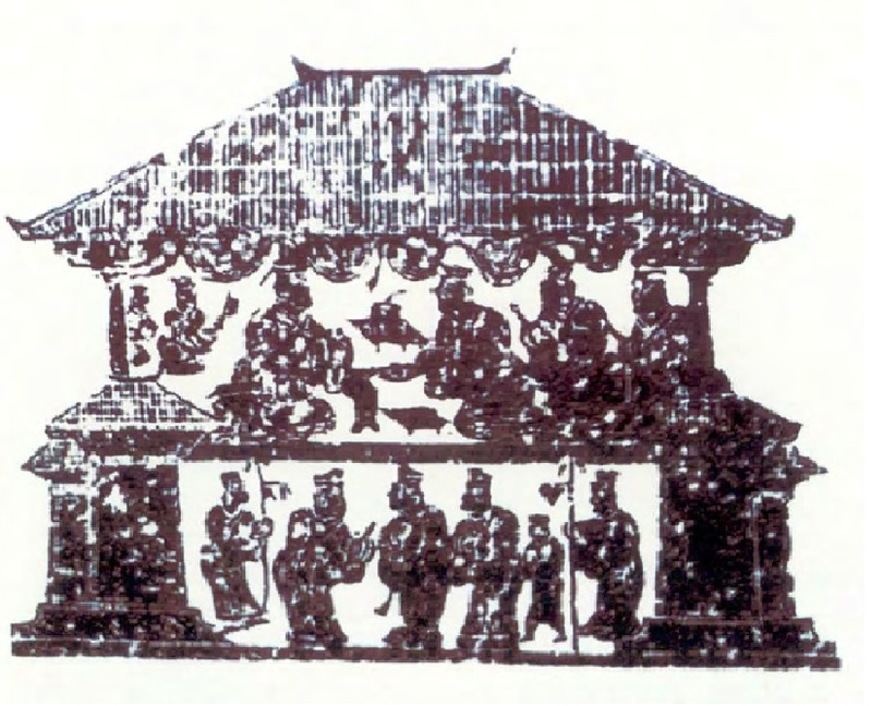 江苏铜山县洪楼祠堂汉画像石,是迎宾饮宴图中的双阙厅堂。画面感强,并且人物逼真。摘自徐星媛,尹钊,戴雪峰.从汉画像石中品汉代建筑之美[J].收藏与投资,2019(11):104-107.